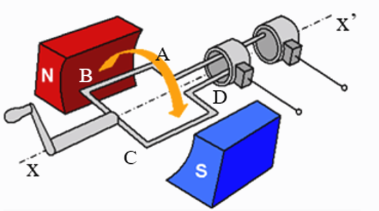 Cho một khung đây có diện tích S, điện trở R, quay đều quanh trục với tốc độ góc ω trong vùng từ trường đều có cảm ứng từ $\overset{\rightarrow}{B}$ (vuông góc với trục quay) được tạo bởi nam châm vĩnh cửu. Chọn mốc thời gian $\left( {t = 0} \right)$ khi mặt phẳng khung dây song song với vector cảm ứng từ như hình vẽ. Chọn chiều dương của dòng điện trong khung là chiều A→B→C→D→A. Nối hai đầu ra của khung với nhau để tạo thành mạch kín. Biểu thức nào sau đây biểu diễn sự biến thiên của giá trị đại số của cường độ dòng điện trong khung theo thời gian?