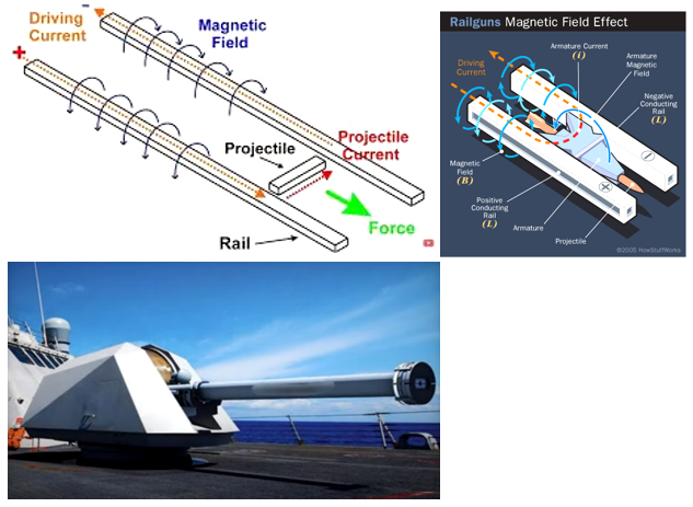 Súng điện tử (Railgun) dùng lực từ đề phóng đầu đạn. Cấu tạo chính của Railgun bao gồm hai thanh tay dẫn điện song song (thanh ray dương và thanh ray âm), một đầu đạn nằm trên thanh dẫn điện nằm giữa chúng. Khi có dòng điện chạy từ thanh ray dương qua thanh dẫn gắn đầu đạn rồi sang thanh ray âm, một từ trường mạnh được tạo ra quanh hai thanh ray. Từ trường này tác dụng lực từ lên dòng điện qua thanh dẫn mang đầu đạn, đẩy đầu đạn di chuyển dọc theo các thanh ray và phóng ra ngoài với tốc độ cực caо.