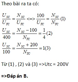 Cuộn sơ cấp của một máy biến áp được mắc vào mạng điện xoay chiều có điện áp hiệu dụng không đổi 100V. Nếu giảm số vòng dây của cuộn sơ cấp đi 100 vòng thì điện áp hiệu dụng hai đầu cuộn thứ cấp là 400V. Nếu từ trạng thái ban đầu tăng số vòng dây ở cuộn sơ cấp thêm 200 vòng thì điện áp hiệu dụng hai đầu cuộn thứ cấp là 100V. Điện áp hiệu dụng ban đầu của cuộn thứ cấp là