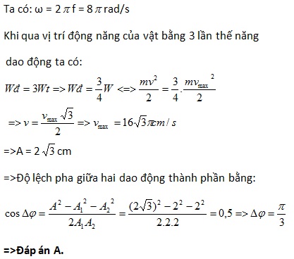 Một vật tham gia đồng thời hai dao động điều hòa cùng phương, cùng tấn số 4Hz và cùng biên độ 2cm. Chọn gốc thế năng tại vị trí cân bằng. Khi qua vị trí động năng của vật bằng 3 lần thế năng dao động, vật đạt tốc độ 24π (cm/s). Độ lệch pha giữa hai dao động thành phần là
