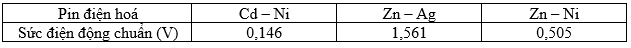 Cho các pin điện hoá và sức điện động chuẩn tương ứng: