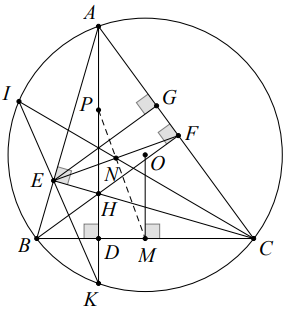 b) Kéo dài $AD$ cắt đường tròn $(O)$ tại điểm thứ hai $K$. Kéo dài $KE$ cắt đường tròn $(O)$ tại điểm thứ hai $I$. Gọi $N$ là giao điểm của $CI$ và $EF$. Kẻ $OM$ vuông góc với $BC$ tại $M$. Gọi $P$ là tâm đường tròn ngoại tiếp $\bigtriangleup AEF$. Chứng minh: $CE^{2} = CI.CN$ và ba điểm M, N, P thẳng hàng.
