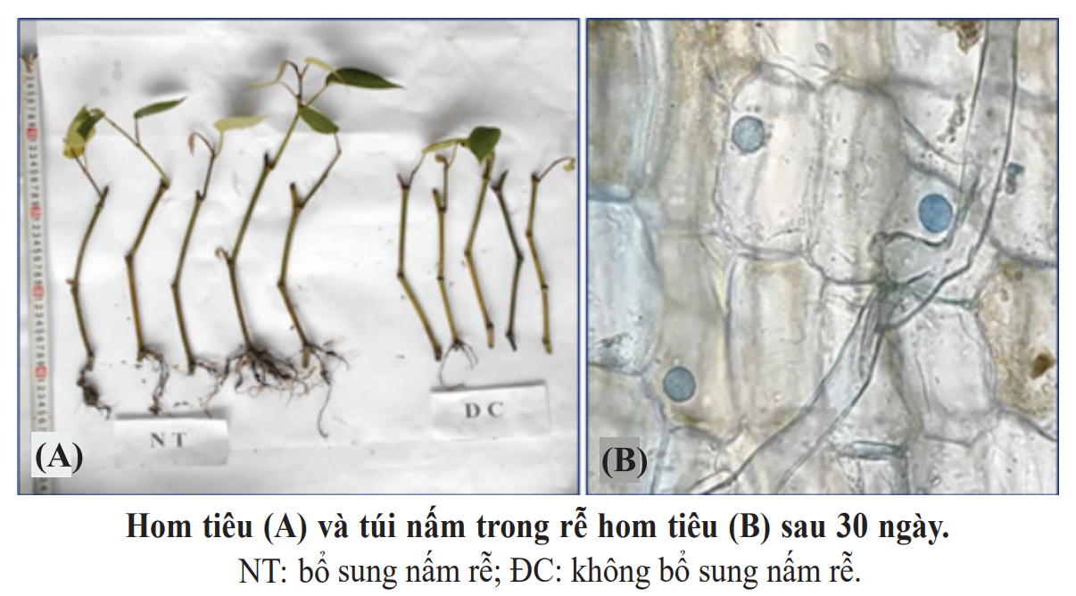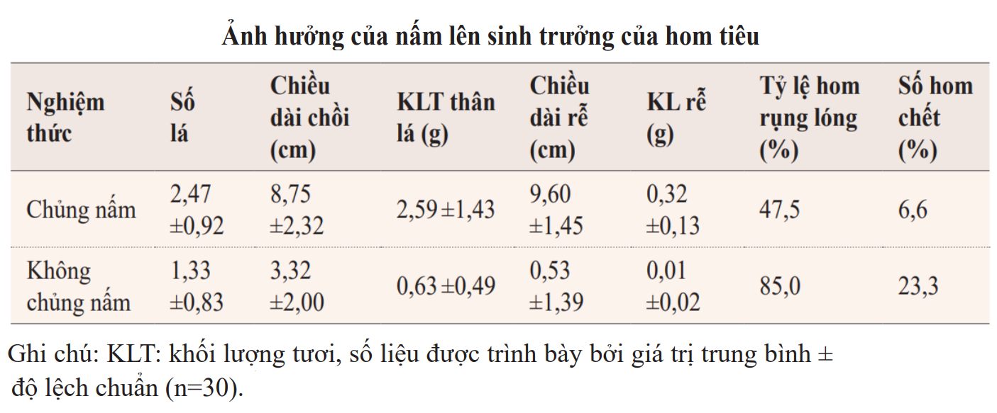 | c) Việc bổ sung nấm rễ vào giá thể giúp giảm rõ rệt hiện tượng rụng lóng và hóa nâu ở hom tiêu. | ||