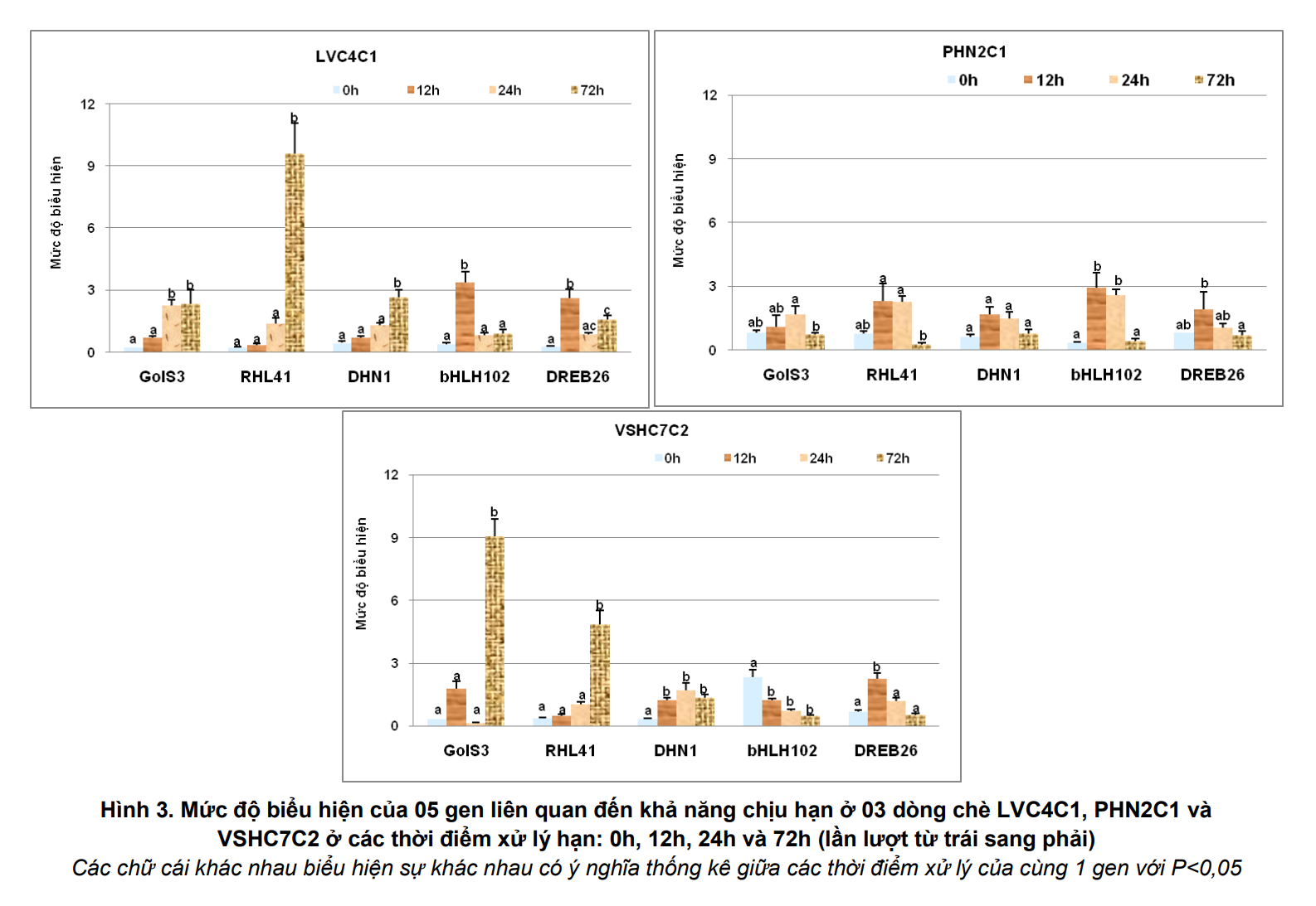 Dựa vào các kết quả đã được nghiên cứu, 05 gene (GolS3, RHL41, bHLH102, DHN1 và DREB26) liên quan đến khả năng chịu hạn đã được lựa chọn để phân tích biểu hiện gene trong điều kiện hạn ở một số dòng chè trồng tại Phú Thọ. Tiếp tục nghiên cứu sự biểu hiện tăng của các gene GolS3, RHL41, bHLH102, DHN1 và DREB26 đối với 3 dòng chè LVC4C1, PHN2C1 và VSHC7C2 trong phản ứng với điều kiện hạn người ta thấy rằng hầu hết các gene trong nghiên cứu này đều có mức biểu hiện tăng ở các dòng chè tại các thời điểm thu mẫu sau xử lý hạn so với mẫu đối chứng (không xử lý hạn).