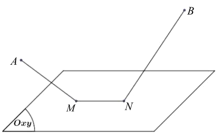 Trong không gian Oxyz, mặt đất là mặt phẳng $(Oxy)$, có hai trạm phát sóng trên không: trạm A đặt trên không tại vị trí $A(1;1;3)$, trạm B đặt trên không tại vị trí $B(10;13;6)$. Trên mặt đất người ta cần đặt hai trạm thu tín hiệu M và N sao cho khoảng cách giữa hai trạm thu là cố định: $MN = 5$ và tổng chiều dài dây nối từ trạm A đến M và từ trạm B đến N là ngắn nhất. Khi đó, tổng hoành độ hai điểm M và N bằng