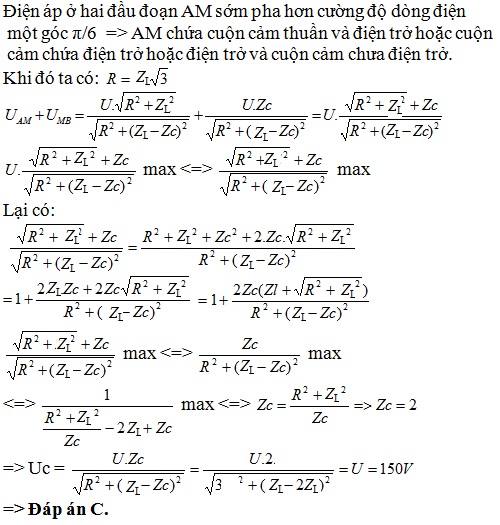 cos100πt (V) . Điện áp ở hai đầu đoạn AM sớm pha hơn cường độ dòng điện một góc
