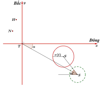 Lập phương trình chuyển động: Viết biểu thức tọa độ tâm bão $S(t)$ và bán kính vùng nguy hiểm $R(t)$ theo thời gian $t$.