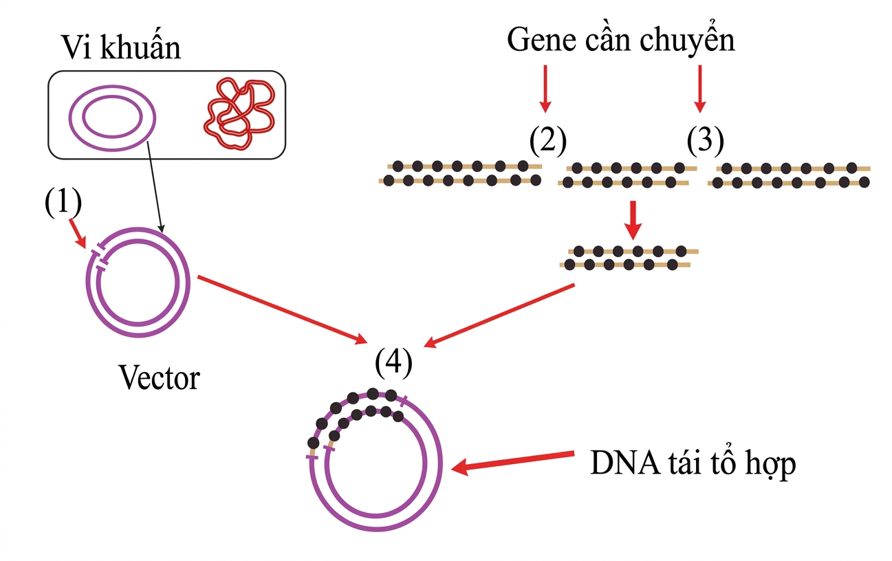 Hình bên mô tả các bước của công nghệ gene. Biết (1), (2), (3), (4)