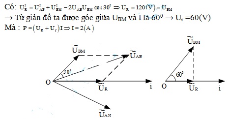 uAB = 120cos100πt (V). Cho uAN lệch pha π/2 so với uMB, uAB lệch pha π/3 so với uAN. Công suất tiêu thụ của cả mạch là 360 W và UMB = 120 V. Cường độ hiệu dụng của dòng điện ở mạch là