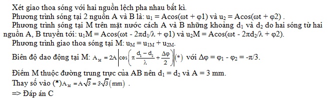 Cho A, B là hai nguồn kết hợp trên mặt nước phương trình dao động tại A và B là: uA = 3cos(ωt) (mm); uB = 3cos(ωt + π/3) (mm). Một điểm M trên mặt nước thuộc đường trung trực của AB sẽ dao động với biên độ là bao nhiêu?