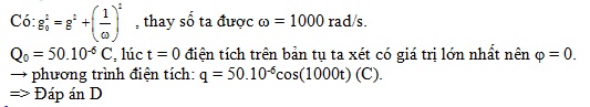 Mạch dao động LC đang có dao động điện từ. Tại các thời điểm điện tích trên một bản tụ có giá trị là q1 = 30 μC, q2 = 25 μC thì cường độ dòng điện ở mạch có giá trị tương ứng là i1 = 0,04 A và i2 = 0,025√3 A. Chọn gốc thời gian là lúc điện tích trên một bản tụ có giá trị lớn nhất. Phương trình điện tích trên bản tụ đó là