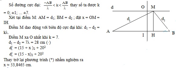 Trên mặt nước có hai nguồn kết hợp cùng pha tại A và B, khoảng cách AB = 30 cm. Sóng do mỗi nguồn phát ra có bước sóng 4 cm. Đường thẳng d thuộc mặt nước song song với đoạn AB và cách AB một đoạn là 20 cm. Trung trực của đoạn AB cắt d tại điểm O. Điểm M thuộc d và dao động với biên độ cực đại sẽ cách O một khoảng lớn nhất là