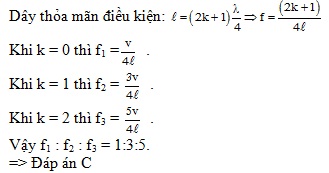 Một sợi dây đàn hồi được treo thẳng đứng đầu trên cố định, đầu dưới tự do. Người ta tạo ra sóng dừng trên dây với tần số bé nhất là f1. Để lại có sóng dừng, phải tăng tần số tối thiểu đến giá trị f2 rồi đến f3. Điều nào sau đây là đúng