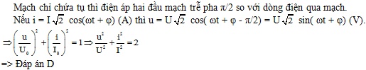 Đặt điện áp u = U√2cosωt (V) vào hai đầu một tụ điện thì cường độ dòng điện qua nó có giá trị hiệu dụng là I. Tại thời điểm t, điện áp ở hai đầu tụ điện là u và cường độ dòng điện qua nó là i. Hệ thức liên hệ giữa các đại lượng là