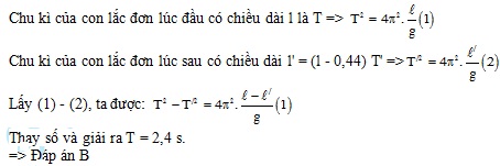 Một con lắc đơn gồm vật nhỏ treo vào sợi dây không giãn có chiều dài đủ lớn. Tại một nơi trên mặt đất, con lắc dao động điều hòa với chu kì T. Giảm chiều dài dây treo con lắc đi 44 cm thì chu kì dao động của con lắc giảm đi 0,4 s. Lấy g = π2 = 10 m/s2. Giá trị của T bằng