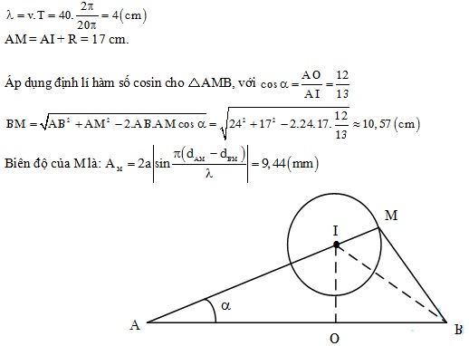 Phương trình sóng tại hai nguồn dao động cùng phương thẳng đứng A và B lần lượt là uA = 5cos(20πt + π) (mm); uB = 5cos20πt (mm). Khoảng cách hai nguồn là AB = 24 cm. Sóng truyền trên mặt nước ổn định, không bị môi trường hấp thụ, vận tốc truyền sóng trên mặt nước là 40 cm/s. Xét đường tròn (C) tâm I bán kính R = 4 cm, điểm I cách đều A, B một đoạn 13 cm. Điểm M nằm trên (C) xa A nhất dao động với biên độ bằng