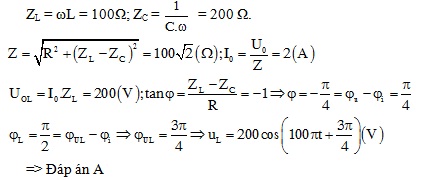 (F) . Cuộn dây thuần cảm. Điện áp ở hai đầu đoạn mạch u = 200cos100πt (V). Biểu thức của điện áp giữa hai đầu cuộn dây có dạng