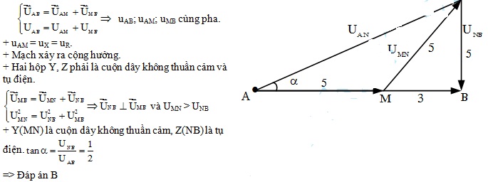 Biết uAB = 8 sin100 π t (V) và các điện áp hiệu dụng: UAM = UMN = 5 V; UNB = 4 V; UMB = 3 V. Mỗi hộp chỉ chứa một loại linh kiện trong số các linh kiện sau: điện trở thuần (R), tụ điện (C), cuộn cảm thuần (L) hoặc cuộn dây không thuần cảm (r; L). Độ lệch pha của uAN so với uAB là α, với tanα bằng