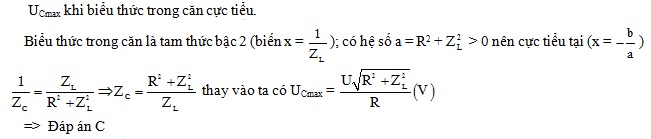Mạch xoay chiều nối tiếp R, L, C. Hiệu điện thế ở hai đầu mạch là u = U√2cosωt (V), chỉ có C thay đổi được. Hiệu điện thế hiệu dụng ở hai đầu tụ điện có giá trị cực đại là