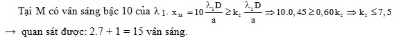 Giao thoa khe Y-âng với ánh sáng đơn sắc λ1 = 0,45 μm. Trong vùng giao thoa trên màn, M và N đối