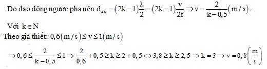Hai điểm A, B cách nhau 10 cm và ở trên cùng phương truyền của sóng hình sin tần số 20 Hz luôn dao động ngược pha nhau. Tốc độ truyền sóng v thỏa mãn 0,6 m/s ≤ v ≤ 1 m/s . Giá trị của v là