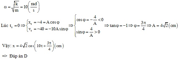 Một quả cầu nhỏ có m = 0,5 kg treo vào đầu 1 lò xo có độ cứng k = 50 N/m. Đầu trên của lò xo cố định. Chọn trục Ox có phương thẳng đứng, chiều dương từ trên xuống, gốc O trùng với vị trí cân bằng, mốc thời gian lúc bắt đầu chuyển động. Nâng quả cầu lên khỏi VTCB 4 cm rồi truyền cho nó vận tốc 40 cm/s hướng lên. Phương trình chuyển động của quả cầu là