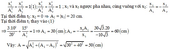 Một vật thực hiện đồng thời 3 dao động cùng phương là: x1 = A1 cos(ωt + π/2) (cm), x2 = A2cosωt (cm), x3 = A3cos(ωt - π/2) (cm). Tại thời điểm t1 các giá trị li độ lần lượt là: -10√3 cm; 15cm; 30√3 cm. Tại thời điểm t2 các giá trị li độ là x1(t2) = -20 cm, x2 (t2) = 0. Biên độ dao động tổng hợp là