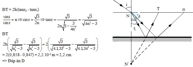 Chiếu một chùm sáng ánh sáng trắng vào bể nước dưới góc tới 600. Chiều cao lớp nước trong