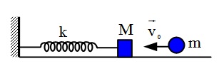 Cho một con lắc lò xo nằm ngang khối lượng không đáng kể có độ cứng k = 20 N/m, một đầu gắn cố định đầu còn lại gắn vật có khối lượngM = 200 g như hình vẽ. Một vật có khối lượng m = 100 g chuyển động với vận tốc v0 = 1,8 m/s tới va chạm với M, biết va chạm giữa m với M là va chạm đàn hồi xuyên tâm. Bỏ qua mọi ma sát. Hỏi sau va chạm lò xo nén cực đại một đoạn bằng bao nhiêu.