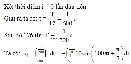 Cho mạch điện xoay chiều có i =10cos(100πt + π/3) (A) chạy qua một dây dẫn. Tìm điện lượng chạy qua tiết diện thẳng của dây dẫn trong 1/6 chu kì kể từ thời điểm I = 0.