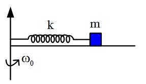 Cho một con lắc lò xo có độ cứng k, khối lượng không đáng kể, một đầu gắn cố định đầu còn lại gắn vật có khối lượng m được đặt trên bàn quay nằm ngang như hình vẽ với vận tốc góc