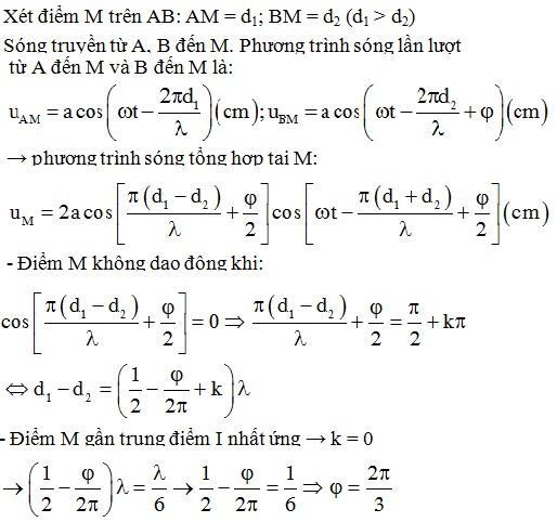 Hai nguồn sóng kết hợp A và B dao động theo phương trình uA = acosωt (cm) và uB = acos(ωt + φ) (cm). Biết điểm không dao động gần trung điểm I của AB nhất một đoạn λ/6. Tìm φ?