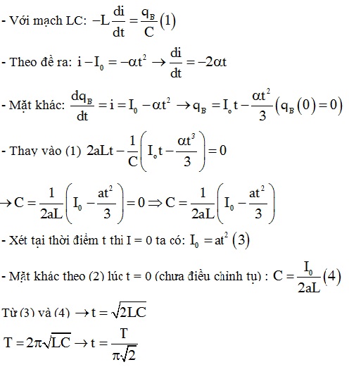 Cho một mạch dao động gồm một tụ điện phẳng có điện dung C và một cuộn dây thuần cảm có độ tự cảm L. Trong mạch có dao động điện từ tự do với chu kì T. Khi cường độ dòng điện trong mạch cực đại thì người ta điều chỉnh khoảng cách giữa các bản tụ điện sao cho độ giảm của cường độ dòng điện trong mạch sau đó tỉ lệ thuận với bình phương thời gian. Chọn gốc thời gian là lúc bắt đầu điều chỉnh, bỏ qua điện trở dây nối. Kể từ lúc bắt đầu điều chỉnh thì cường độ dòng điện trong mạch bằng không sau một khoảng thời gian