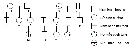 Sơ đồ phả hệ dưới đây mô tả hai bệnh di truyền ở người, bệnh bạch tạng do một gen có 2 alen trên NST thường quy định, bệnh mù màu do một gen có 2 alen trên NST X tại vùng không tương đồng trên Y quy định.