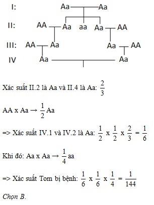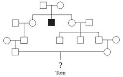 Phả hệ dưới đây mô tả sự di truyền của một bệnh do một alen rất hiếm gặp trong quần thể người Bắc âu qui định. Dựa vào phả hệ tính xác suất để đứa trẻ Tom sinh ra bị bệnh là bao nhiêu?