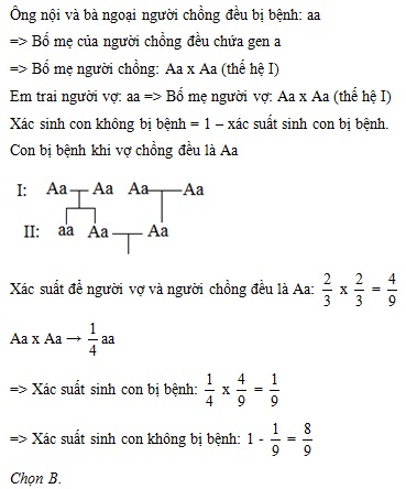 Ở người, bệnh Q do một alen lặn nằm trên nhiễm sắc thể thường quy định, alen trội tương ứng quy định không bị bệnh. Một người phụ nữ có em trai bị bệnh Q lấy một người chồng có ông nội và bà ngoại đều bị bệnh Q. Biết rằng không phát sinh đột biến mới và trong cả hai gia đình trên không còn ai khác bị bệnh này. Xác suất sinh con đầu lòng không bị bệnh Q của cặp vợ chồng này là: