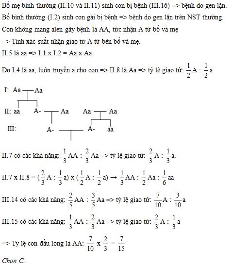 Biết rằng không phát sinh đột biến mới ở tất cả các cá thể trong phả hệ, xác suất sinh con đầu lòng không mang alen gây bệnh của cặp vợ chồng III.14 – III.15 là: