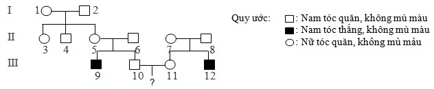 Ở người, gen quy định dạng tóc nằm trên nhiễm sắc thể thường có hai alen, alen A quy định tóc quăn trội hoàn toàn so với alen a quy định tóc thẳng. Bệnh mù màu đỏ - xanh lục do alen lặn b nằm trên vùng không tương đồng của nhiễm sắc thể giới tính X quy định, alen trội B quy định mắt nhìn màu bình thường. Cho sơ đồ hả hệ sau: