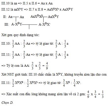 Biết rằng không phát sinh các đột biến mới ở tất cả các cá thể trong phả hệ. Cặp vợ chồng III10 – III11 trong phả hệ này sinh con, xác suất đứa con đầu lòng không mang alen lặn về hai gen trên là: