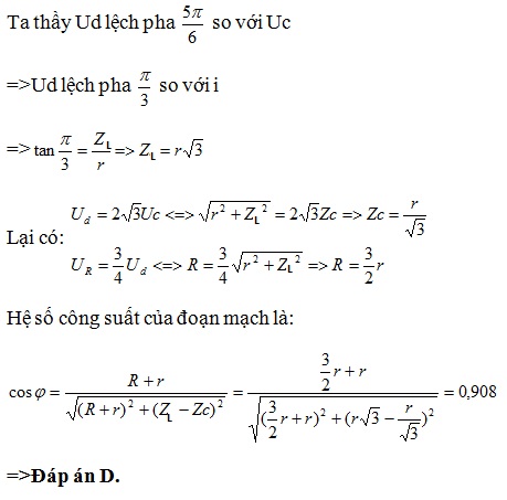 Một đoạn mạch xoay chiều gồm 3 phần tử mắc nối tiếp: điện trở thuần R, cuộn dây có (L; r) và tụ điện có điện dung C. Đặt vào hai đầu đoạn mạch một điện áp xoay chiều, khi đó điện áp tức thời ở hai đầu cuộn dây và hai đầu tụ điện lần lượt là: ud = 80cos(ωt +