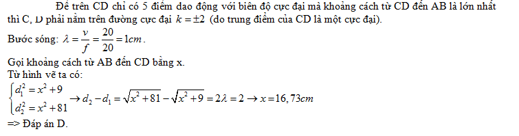 cm: , tốc độ truyền sóng trên mặt chất lỏng là 20cm/s . Xét đoạn thẳng CD= 6cm trên mặt chất lỏng có chung đường trung trực với AB. Để trên đoạn CD chỉ có 5 điểm dao động với biên độ cực đại thì khoảng cách lớn nhất từ CD đến AB là bao nhiêu?