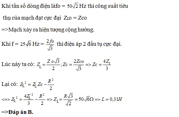 Hz thì hiệu điện thế hiệu dụng giữa hai bản tụ đạt cực đại. Giá trị độ tự cảm gần đúng bằng:
