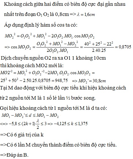 Hai nguồn kết hợp O1; O2 cùng pha, cùng biên độ, cách nhau 40cm. Khoảng cách giữa hai điểm có biên độ cực đại gần nhau nhất trên đoạn O1 O2 là 0,8cm. Điểm M thuộc miền giao thoa cách O1 một đoạn 25 cm, cách O2 một đoạn 22 cm . Dịch chuyển nguồn O2 từ từ dọc theo phương O1 O2 ra xa nguồn O2 một đoạn 10cm thì số lần điểm M chuyển thành điểm có biên độ cực tiểu là: