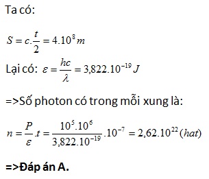 Trong thí nghiệm đo khoảng cách từ Trái Đất lên Mặt Trăng bằng laze người ta đã sử dụng laze có bước sóng 0,52 mm. Thiết bị sử dụng để đo là một máy vừa có khả năng phát và thu các xung laze. Thời gian kéo dài mỗi xung là 10-7 s, thời gian giữa thời điểm phát và thời điểm nhận xung phản xạ của máy đặt ở Trái Đất là 2,667 s , công suất của chùm laze là 100000 MW. Số phôtôn chứa trong mỗi xung và khoảng cách từ mặt trăng đến trái đất là: