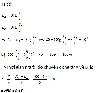 Một nguồn điểm O phát sóng âm có công suất không đổi trong một môi trường truyền âm đẳng hướng và không hấp thụ âm. Một người đang chuyển động thẳng đều từ A về O với tốc độ 5 (m/s). Khi đến điểm B cách nguồn 10m thì mức cường độ âm tăng thêm 20dB. Thời gian người đó chuyển động từ A đến B là: