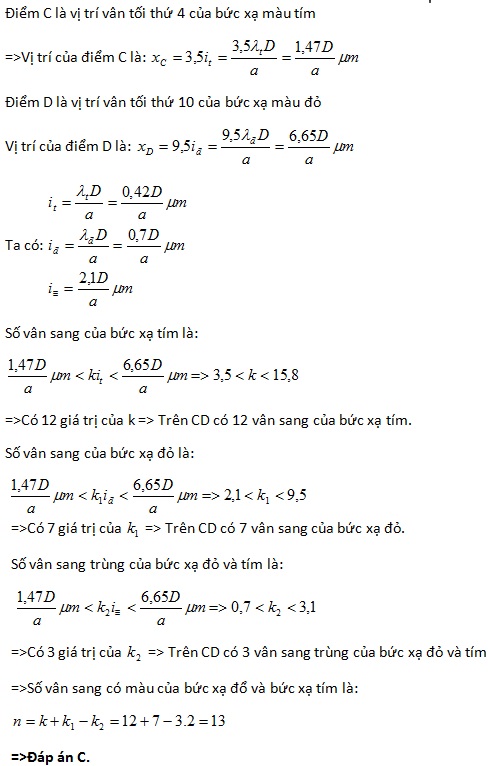 Trong thí nghiệm Y - âng, chiếu sáng khe F đồng thời hai bức xạ đơn sắc: màu tím có bước sóng λ1 = 0,42 μm và màu đỏ λ2 = 0,70 μm. Hai điểm C và D nằm trong vùng giao thoa trên màn và ở cùng một phía so với vân sáng chính giữa O. Điểm C là vị trí vân tối thứ 4 của bức xạ màu tím, điểm D là vị trí vân tối thứ 10 của bức xạ màu đỏ. Trong khoảng giữa C và D, tổng số vị trí vân sáng có màu tím và màu đỏ bằng