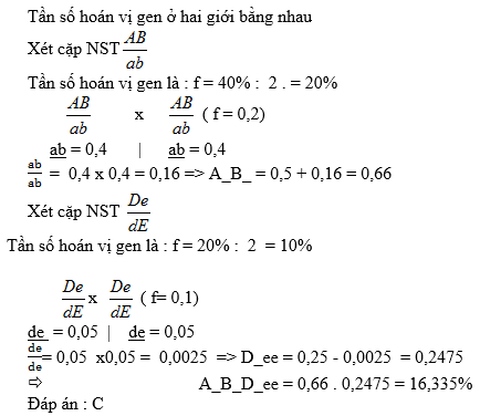 tự thụ phấn, trong quá trình giảm phân tạo giao tử 40 % tế bào sinh hạt phấn xảy ra hoán vị gen ở cặp NST mang gen A, B; 20% tế bào sinh hạt phấn xảy ra hoán vị gen ở cặp NST mang gen D, E. Biết rằng mỗi gen quy định một tính trạng, gen trội hoàn toàn và hoán vị gen xảy ra trong quá trình phát sinh giao tử đực và cái với tần số bằng nhau. Tính theo lí thuyết thì tỉ lệ cây F2 có kiểu hình A-B-D-ee là