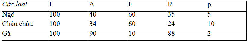 Các dẫn liệu sau đây biểu thị dòng năng lượng đi qua một chuỗi thức ăn trong hệ sinh thái gồm các loài ngô, châu chấu và gà. Các thông số liên quan đến dòng năng lượng (biểu thị qua tỉ lệ %) gồm: I là năng lượng tiêu thụ, A là năng lượng hấp thụ, F là năng lượng thải bỏ (phân, nước tiểu, vỏ cây..), R là năng lượng mất đi do hô hấp và p là năng lượng sản xuất được.