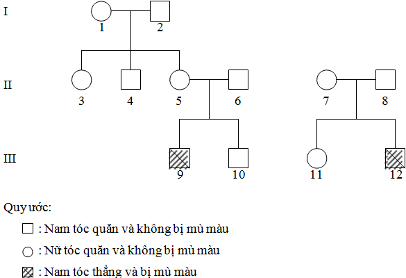 tóc quăn trội hoàn toàn so với alen a quy định tóc thẳng; Bệnh mù màu đỏ - xanh lục do alen lặn b nằm trên vùng không tương đồng của nhiễm sắc thể giới tính X quy định, alen trội B quy định mắt nhìn màu bình thường. Cho sơ đồ phả hệ sau: