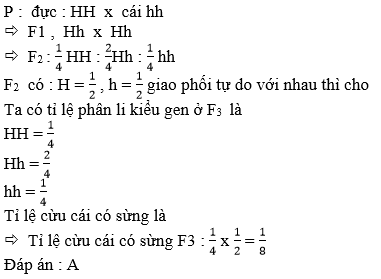 Ở cừu, gen H quy định có sừng, gen h quy định không sừng, kiểu gen Hh biểu hiện có sừng ở cừu đực và không sừng ở cừu cái, gen nằm trên nhiễm sắc thể thường. Cho lai cừu đực không sừng với cừu cái có sừng được F1, cho F1 giao phối với nhau được F2, cho các cừu F2 giao phối tự do.Theo lý thuyết, tỷ lệ cừu cái có sừng ở F3 là bao nhiêu ?